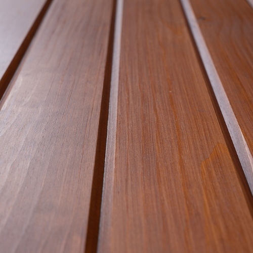 HORIZONTAL SURFACES: On horizontal cedar, mahogany, and other dense woods, apply only one coat of finish. For pressure treated lumber and other porous woods apply two wet-on-damp coats, waiting approximately 10-15 minutes between coats. It is very important to not let the first coat dry completely before applying the second coat. Brush product into surface working out all drips, puddles, or areas of overspray before product dries. Do not over apply finish. To avoid the possibility of peeling, apply only as much finish as the wood can easily absorb. A sure indication of over application is a shiny appearance. Two coats are usually adequate, but depending on the porosity of the wood, more or less stain may be needed. Complete entire sections or to a natural break before allowing to dry. Never break in the middle of a board. Thoroughly coat the ends of boards or logs to prevent water penetration. All surface checks on logs should be thoroughly coated. Horizontal surfaces may require maintenance coats more frequently than vertical surfaces as they typically receive more direct sunlight as well as more wear and tear.