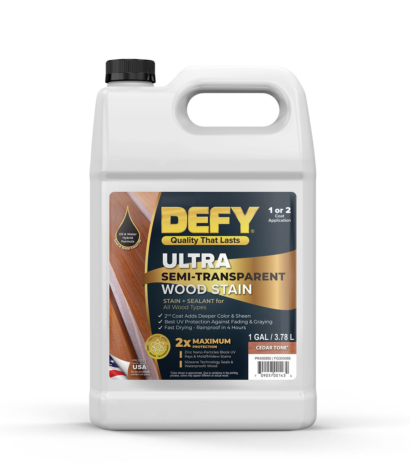 DEFY Essential Semi-Transparent Wood Stain is a durable wood finish that helps protect against the damaging effects of the elements on all types of wood surfaces including decks, fences, wood siding, log homes, outdoor furniture, and other natural wood surfaces. This water-based product provides a natural looking flat finish that highlights the wood grain and adds color. For use on all wood types including pressure treated lumber, pine, cedar, redwood, mahogany, and other hardwoods.